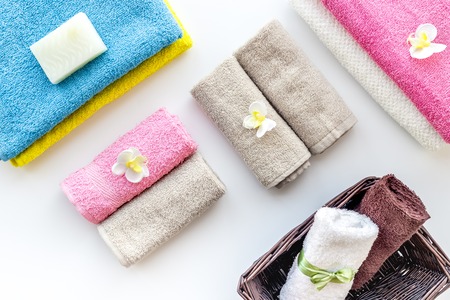 stack of towels for bathroom bottle on a white marble background, space for text, selective focus