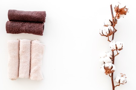 Spa concept. Set of towels twisted coil near cotton flowers on white background top view copy space