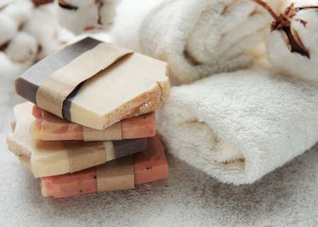 Concept of spa with natural organic handmade soap, cotton flowers and massage towels.