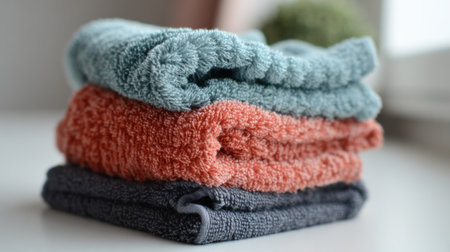 Three neatly folded towels in shades of blue, orange, and gray sit together on a countertop, illuminated by soft natural light from the nearby window.
