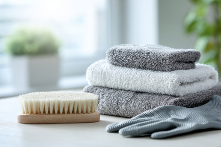 Stack of microfiber towels with wooden cleaning brush and gloves