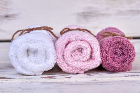 Colorful purple violet beige rolled up towels for Barbershop, Spa Bath Swimming pool, sea Beach, gym fitness in resort hotel concept. Fabric texture cloth background