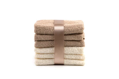 Gift set of white and light brown Terry towels on a white background. Side view vertical orientation. The concept of home textiles.