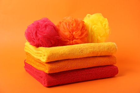 This image showcases soft towels, a natural sponge, and bath accessories on a warm yellow backdrop, creating a serene atmosphere for self-care.