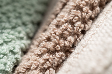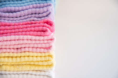 Colorful folded cloths on a light background, showcasing a variety of soft pastel hues The fabric appears cozy and inviting, ideal for home decoration or fashion concepts