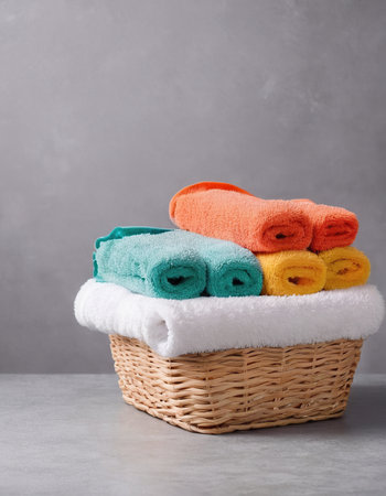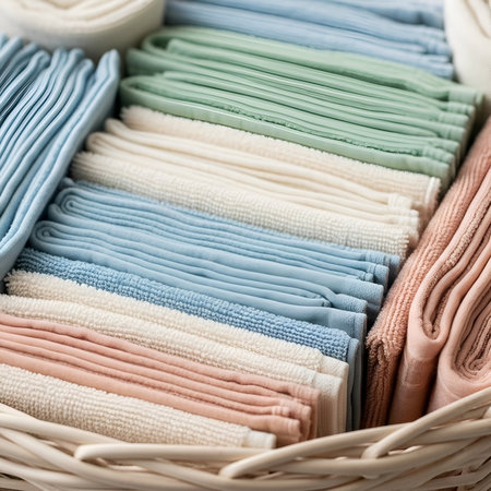 A close-up showcases neatly folded pastel-colored towels in a wicker basket, bathed in soft, diffused light, creating a calming and organized textile display.