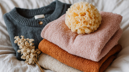 A natural yellow sponge on towels stacked on a white wooden table. Personal care and hygiene. Bath and relax