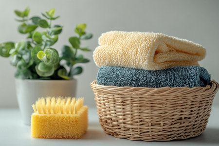 This image features a curated collection of eco-cleaning essentials: brushes, sponges, and cloths arranged in a basket against a clean white backdrop It highlights a conscious approach to cleaning, promoting natural, eco-friendly products for a healthier home Discover sustainable alternatives to elevate your routine and embrace a clean, green living AI Generative