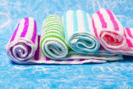 A visually appealing arrangement of rolled towels in vibrant pastel colors against a soft blue background, perfect for creating a cozy and relaxing atmosphere in any setting.