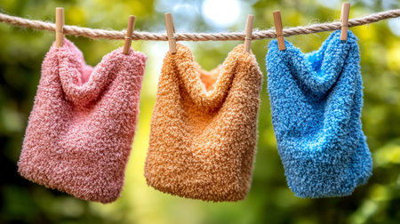 The image shows three small, soft-looking washcloths in pink, orange, and blue, each suspended from a twisted rope using simple wooden clothespins. They hang against a blurred background of green foliage, suggesting they are drying outdoors. The bright colors and soft texture of the cloths are the main focus of the shot.