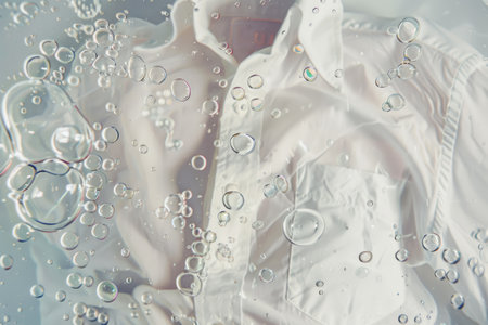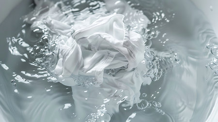 Experience the dynamic visual of a washing machine drum filled with white fabric, generating bubbles and foam during the wash cycle. A representation of domestic cleanliness.