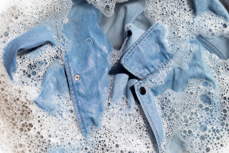 Jean shirt soak in powder detergent water dissolution, washing cloth. Laundry concept