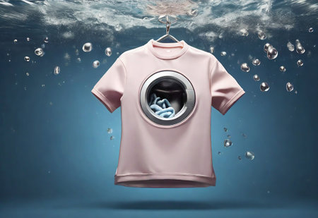 Washing machine, liquid detergent with floating t-shirt under water with bubbles and wet splashes, laundry work as banner design with copy space