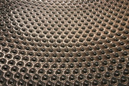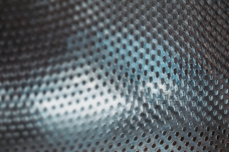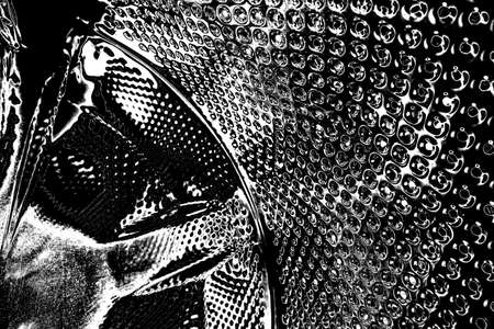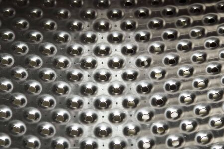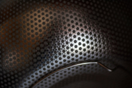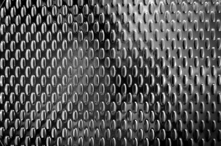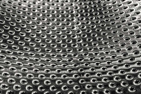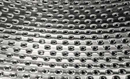 A kitchen item in the hole for filtering water. Metal mesh texture. Background from a plain silver steel object.