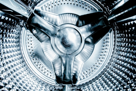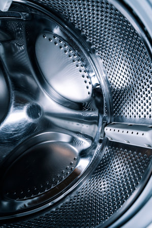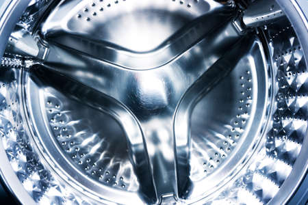 washing machine with an empty stainless steel drum with blue tint, metal parts for design and background
