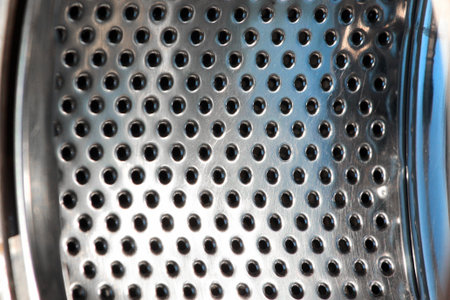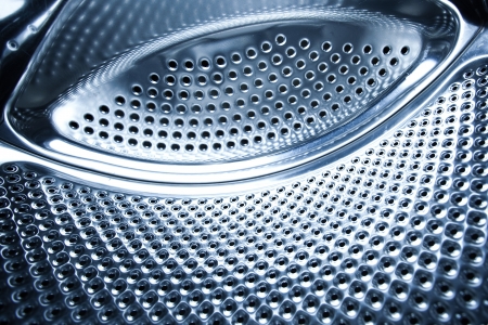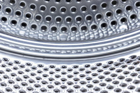 Perforated steel drum of washing machine. Inside view. Abstract industrial background