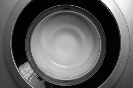 Empty, clean, domestic washing machine or drier drum. Wide angle inside view, close up, no people.