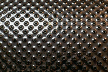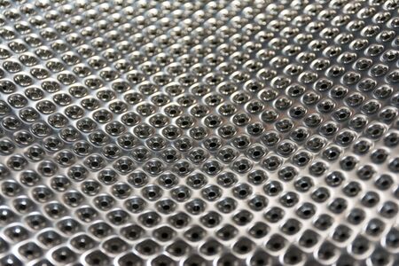 Metal part made of steel. On the back wall there is a small perforation, holes. Brilliant, reflective texture. Abstract drawing, background.