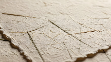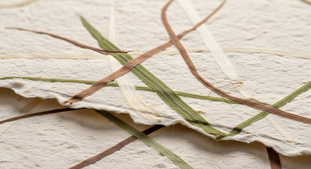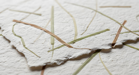 A close-up, macro view of handmade, recycled paper with a rough, deckled edge. Dried grass fibers are visibly embedded in the textured, off-white surface, highlighting its natural, eco-friendly, and artisanal quality.