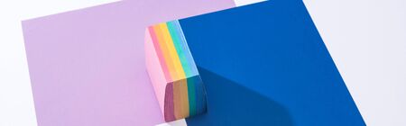 panoramic shot of colorful papers and sticky notes on white background