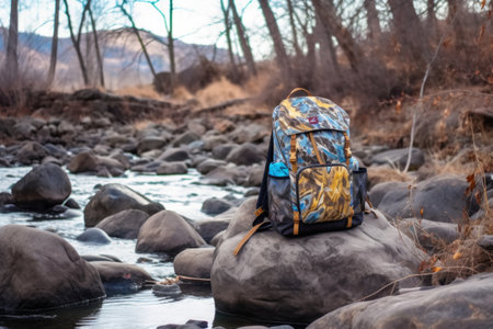 A vibrant outdoor backpack rests beside a scenic river, surrounded by lush greenery. Ideal for camping and hiking adventures, this backpack merges style and practicality.