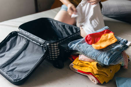 A woman folds clothes from a pile of selected belongings and puts them in luggage. I'm packing to go on vacation.