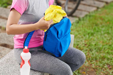 Unrecognizable woman putting a water bottle to prepare emergency backpack in living room