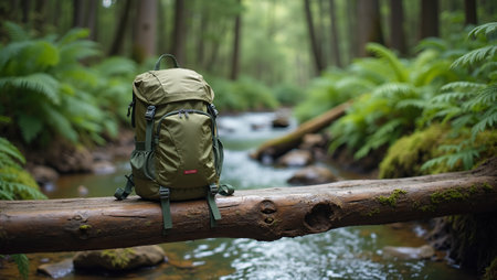 Serene hiking backpack on wooden bridge over clear stream in lush forest