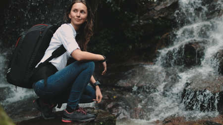 Female Hiker Crouch near Wild Splashing Waterfall. Caucasian Girl Explorer with Backpack Squat on Stone at Mountain Stream Alone. Tourist Admire Water Flow on Rocks.
