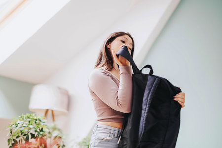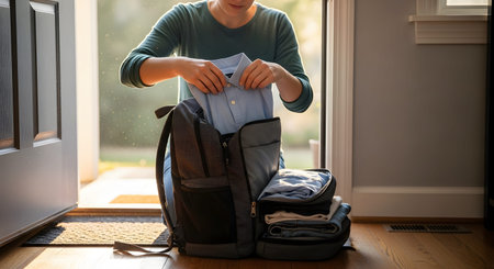 A person packs a folded blue shirt into a grey travel backpack in a sunlit room near an open door. The scene captures the excitement of preparing for a trip, vacation, or commute.