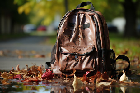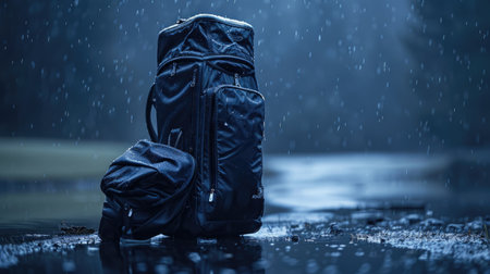 Moody Backpack Laying on Wet Pavement in Dramatic Lighting Conditions