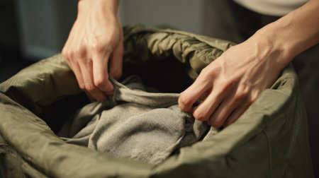 Medium shot of a person loading clothes into an advanced laundry bag with reinforced seams emphasizing the sturdy construction and innovative fabric blend.
