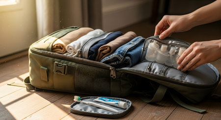 Hands pack a clear toiletry bag into a green travel backpack that is already neatly organized with rolled clothes. The scene takes place on a wooden floor in sunlight, representing travel preparation and organization.
