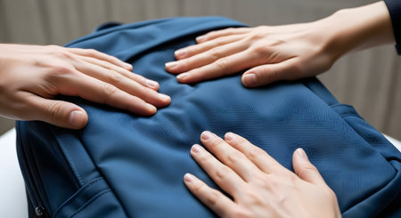 Close-up view of two hands touching and feeling the fabric texture of a blue backpack. The image focuses on the quality of the material and the tactile experience of shopping for or inspecting a new bag.