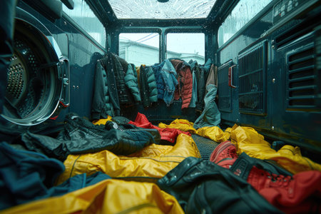 A person in an orange jacket washes clothes outdoors in the rain, surrounded by camping gear. Water splashes dramatically from the fabric, capturing the essence of adventure.
