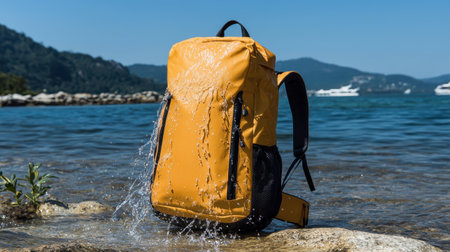 Vibrant Yellow Waterproof Backpack Standing in Shallow Water with Splashes, Surrounded by Scenic Landscape and Clear Blue Sky, Perfect for Outdoor Adventures