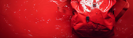 Stylish Red Backpack on Vibrant Red Background with Splashes of Water Perfect for Everyday Use, Travel, and Outdoor Adventures AI Generative