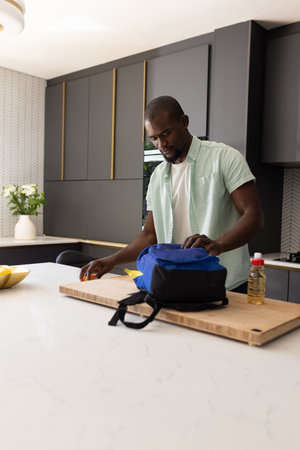 Young African American man packing blue lunch bag on kitchen island with cooking oil, copy space. Meal prep, wellness, lifestyle, insulated cooler, marble countertop, modern, matte