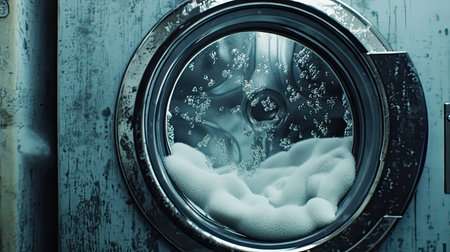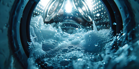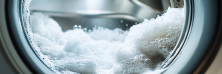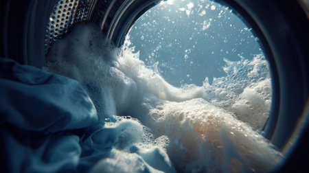 A mesmerizing view of a washing machine filled with bubbles and foam, showcasing the cleansing process in a modern laundry setup, emphasizing cleanliness and maintenance.