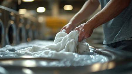 A person is handling white towels in a commercial laundry facility. The setting is bright and busy, with machines operating efficiently in the background.