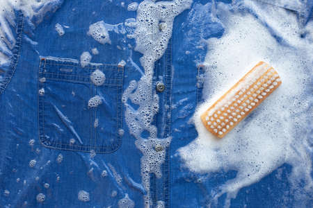 Jeans in laundry basket with wooden brush for cleaning clothes on foam of powder detergent water dissolution on blue background. Top view