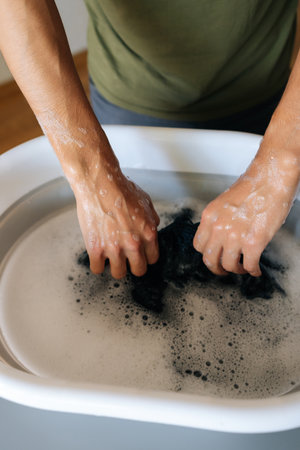 Close-up of a woman washing clothes by hand in a sink with soap suds.