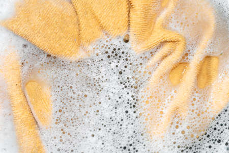 yellow cloth dipped in water with white foam