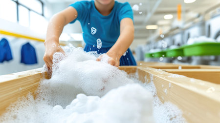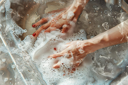 Gentle hands wash delicate fabric in bubbles, evoking a cozy atmosphere with soft textures and calming water flow, emphasizing cleanliness and care in daily routines.