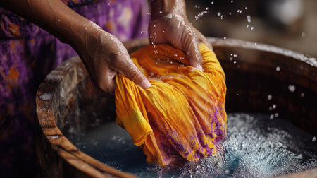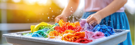 A person is washing vibrant clothing in a basin under warm sunlight, creating splashes of water and joy.