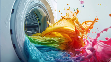 A vibrant depiction of laundry with colorful clothing and flowing detergent, highlighting a fresh and clean washing experience