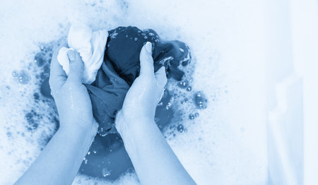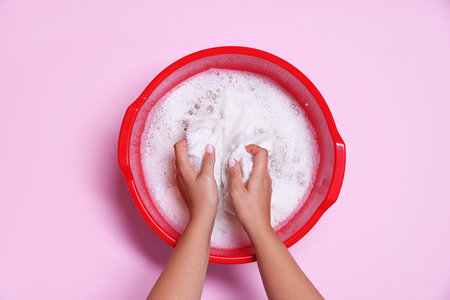 Female hands wash clothing by hand with detergent in basin. selective focus and space for text.