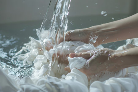 Gentle hands wash delicate fabric in bubbles, evoking a cozy atmosphere with soft textures and calming water flow, emphasizing cleanliness and care in daily routines.