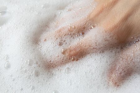 Hand in white pure soap foam or shampoo. Gentle hygiene