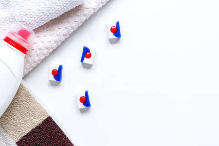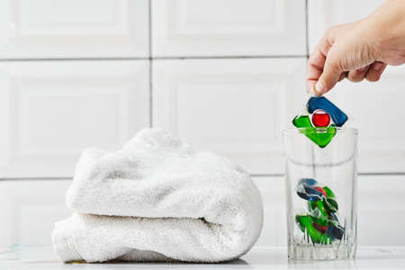Towel with laundry capsules and detergent on the top of washing machine. Laundry capsules or also known as laundry gel in capsules and white towel